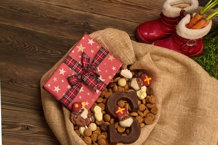 Festive Treats and Gifts. Sinterklaas chocolates and cookies in a burlap sack on a wooden table.