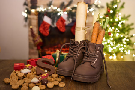 Festive St. Nicholas Sinterklaas Display. A cozy holiday scene with boots, carrots, treats