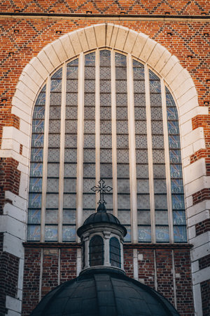 Window with mosaic and arch of Corpus Christi Basilica, beautiful details of Gothic church and landmark in Krakow, Poland