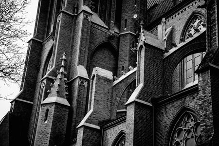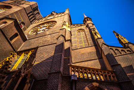 symmetrical view of a cathedral wall with big stained glass windows in Oosterhout, The Netherlands