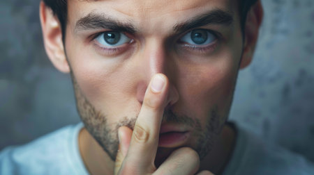 Close up portrait of a young man with a finger on his lips