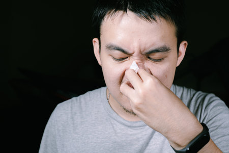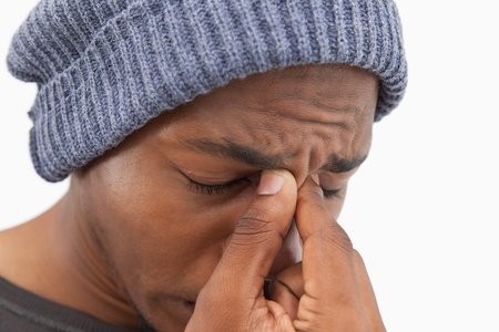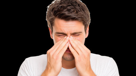 Person with sinusitis and nasal inflammation. Man with nasal congestion isolated