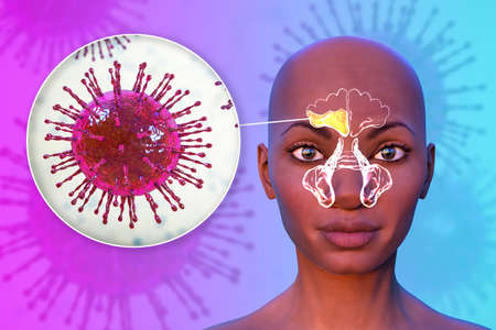 Sinusitis, inflammation of paranasal cavities. 3D illustration showing purulent inflammation of right frontal sinus in a person and close-up view of viruses that cause sinusitis