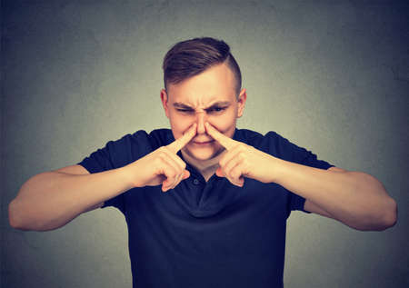 man pinches nose with fingers looks with disgust something stinks isolated on gray background.