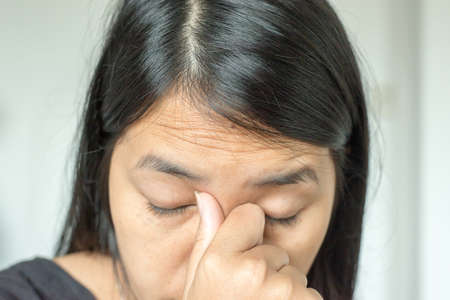 Unhappy japanese woman rubbing red sore nose