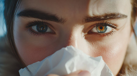 Allergic rhinitis concept with a close-up of a woman sneezing and holding a tissue, emphasizing the impact of allergies.