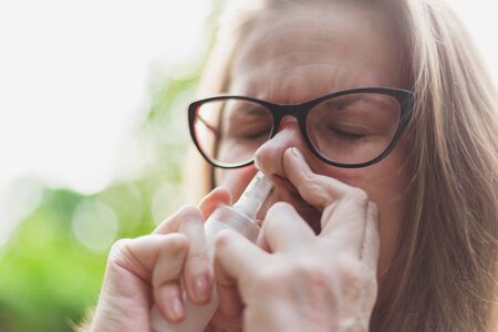 Woman using nose spray for allergies outdoors - Portrait of cute girl wearing eyeglasses administering nasal treatment for seasonal allergies - Saline medicine for respiratory problems