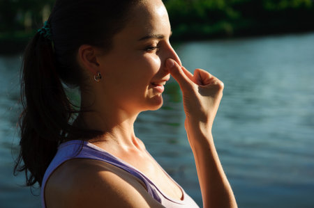 Close up of a womans nose breathing, showcasing delicate skin texture, nostrils, and pores, highlighting beauty, skincare, and the sense of smell