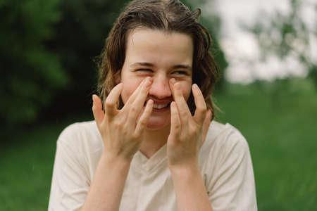 Close-Up Portrait Of Teenager Girl. Happy Cheerful Teen Girl With Pronounced Face From Sprayed Small Splashes Of Water Or Warm Summer Rain In Outdoors.