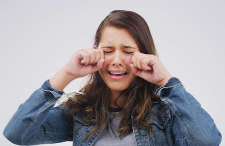It isnt the end of the world. Studio shot of a young woman crying while standing against a gray background.
