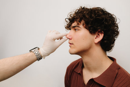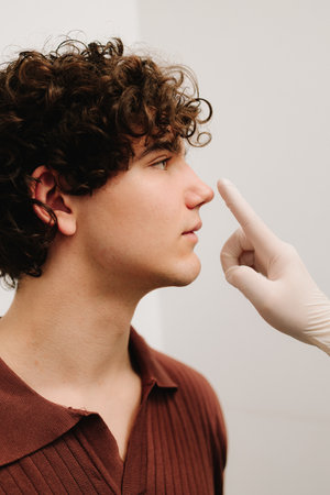Rhinoplasty to change size or shape of nose and fix issues from injury or improve breathing problems. ENT doctor touching nose of patient before rhinoplasty or septoplasty surgery
