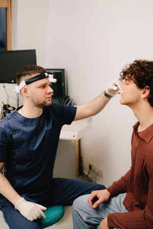 Rhinoscopy medical examination at a private ENT clinic before rhinoplasty or septoplasty surgery. ENT doctor checking nose of man patient with rhinoscope