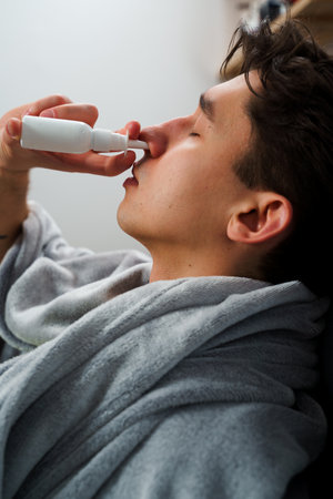 Sick patient takes nose drops for sinusitis treatment. Man is taking medical pills and sprays by doctor's prescription at home