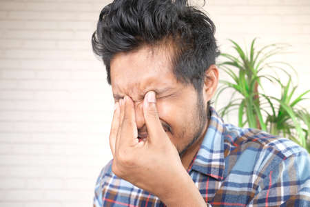Unhappy middle aged man pressing nose with both hands and closing eyes in discomfort, showing symptoms of sinus pain, allergy, nasal congestion, respiratory problem, health issue and medical condition