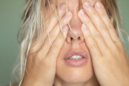 young girl covered her face with hands closeup portrait on an isolated background