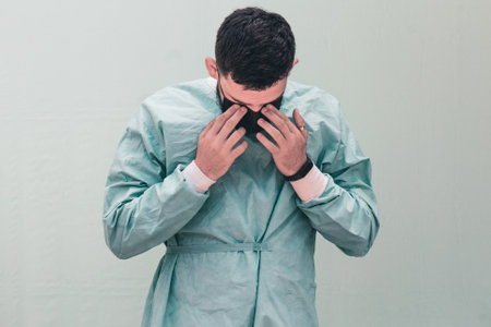 A young Cuban male doctor adjusting his face mask on plain light background