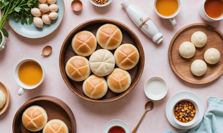 AI Generated. Serene Morning Scene with Steaming Buns and Warm Golden Light