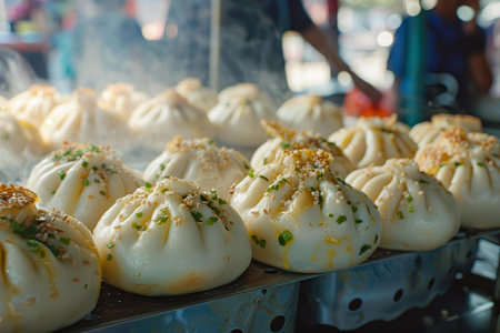 AI Generated. Deliciously Soft Steamed Breads Displayed on a Metal Platter at a Vibrant Street Food Stall During a Bustling Evening Market Scene