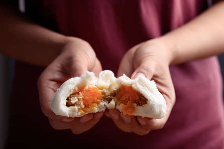 Steamed bun stuffed with minced pork and salted egg holding by hand and eating, Asian food