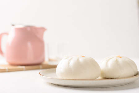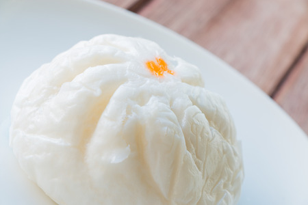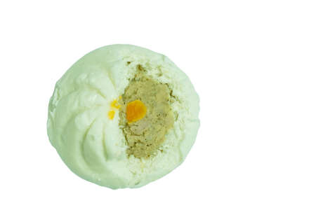 steamed bao Chinese bun stuffing mashed pork and salt egg on white background