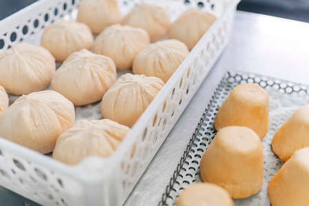 Fresh prepared asian steamed buns on local market. Traditional thai cuisine made of fresh ingredients.