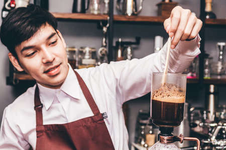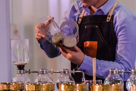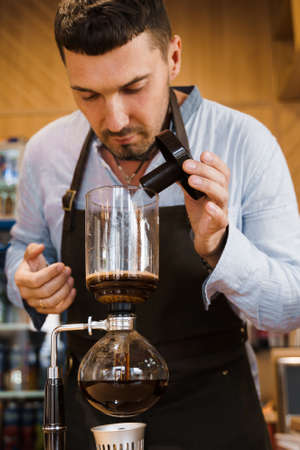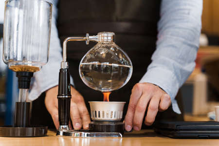 Professional coffee maker - Barista using coffee siphon brewing hot espresso at coffee shop