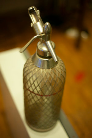 vintage seltzer bottle on table
