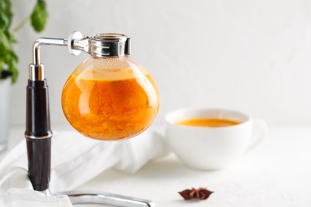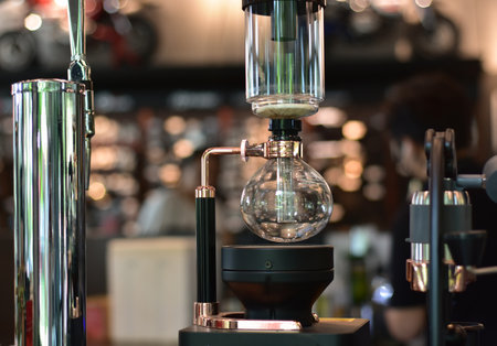 modern siphon coffee maker with glass coffee pot for making pour-over espresso in coffee shop