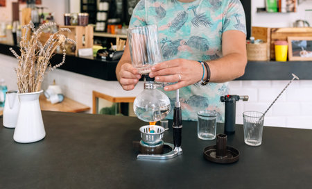Unrecognizable barista expertly uses a Japanese siphon coffee maker in a modern cafe setting, showcasing the art of specialty coffee brewing. The process involves precision and attention to detail.