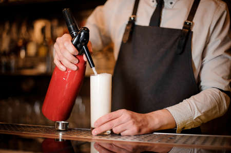 Bartender adding a water from the syphon to the sour white cocktail at the bar counter