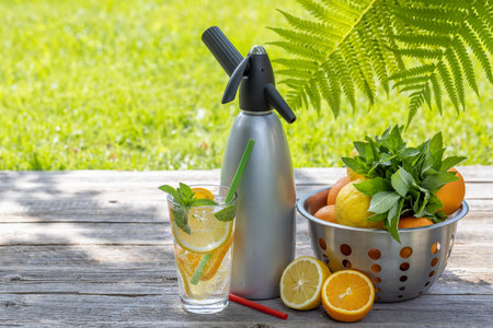 Refreshing homemade lemonade served on an outdoor garden table. Cold summer drink with fresh citrus fruit and garden mint