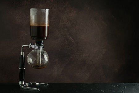 Vacuum coffee maker also known as vac pot, siphon or syphon coffee maker on rustic black stone table. Copy space for your text