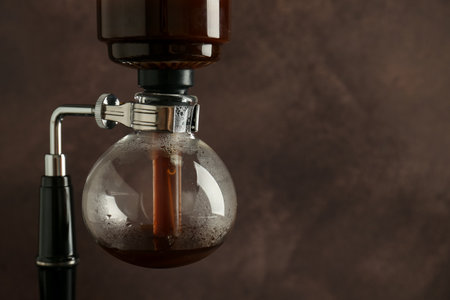Siphon (vacuum) coffee maker with coffee against brown background, closeup. Space for text