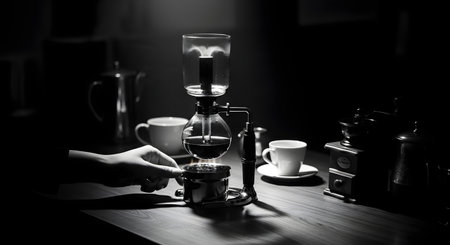 A vintage coffee syphon maker on a wooden table with a cup of coffee and a hand reaching for it in a dark and moody setting with black and white tones