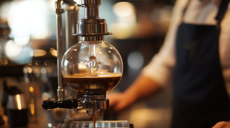 Barista expertly uses a Japanese siphon coffee maker in a modern cafe setting, showcasing the art of specialty coffee brewing. The process involves precision and attention to detail.