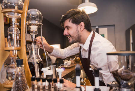 Handsome barista making coffee on syphon coffee maker in the cafe