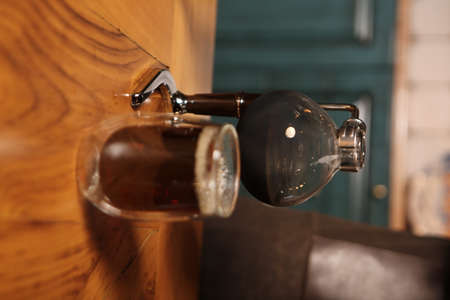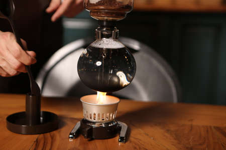 Syphon coffee close-up device with fire heats glass flask in cafe. Alternative coffee brewing method. Creative idea for advert in cafe. Professional device for coffee.