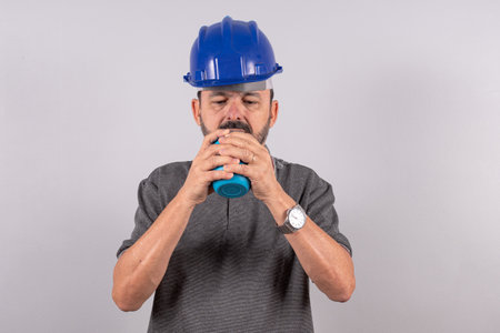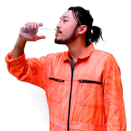 Asian engineer standing drinking mineral water to wellness from plastic bottle isolated on white background.