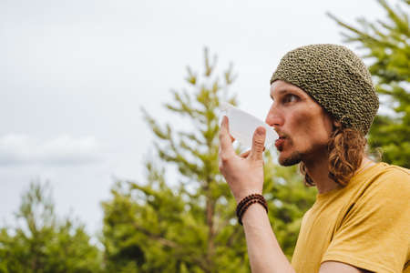 A hipster in a yellow hat drinks tea against the background of nature, a white plastic mug, a hand holding a glass of water, a guy drinks water, a hike in the forest.