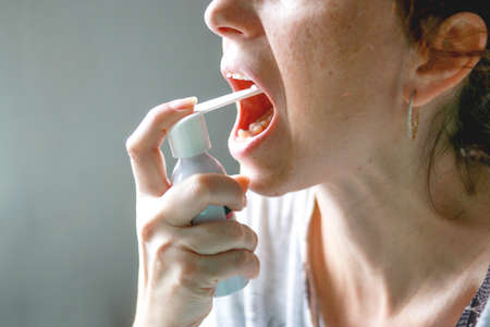 Middle-aged woman. With red hair. With a tired, sickly face. Sprays a spray for sore throat. On a gray background. Horizontal photo. Concept: disease, virus, treatment, medicine, cold.