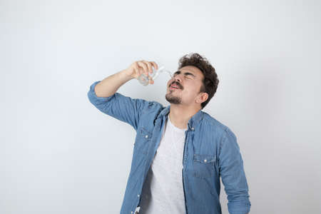 Young man finishes alcohol from a glass on a gray background