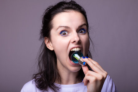 beautiful girl in a white t-shirt holds a blue light bulb in her hands