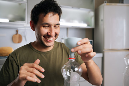 Cheerful gardener male pouring organic fertilizer through funnel into plastic bottle, mixing nutrient-rich solution for healthy garden plants. Concept of healthy and sustainable cultivation.