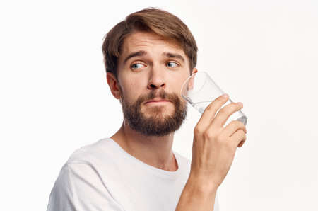 handsome guy with a glass of water on a white background t-shirt cropped view Model