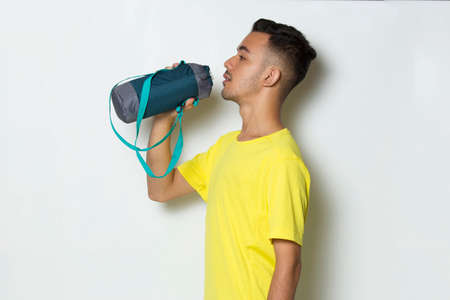Young handsome sport man drinking water after workout on white background
