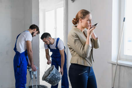 Woman calling plumber while collecting water