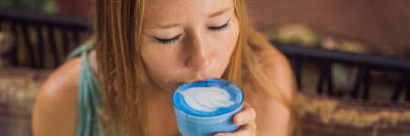 Young woman having a Mediterranean breakfast seated at sofa and drinks Trendy drink