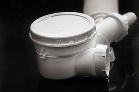 Siphon white durable plastic PVC bathroom close-up on a black background.