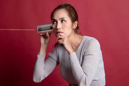Young Asian woman hearing with tin can phone and thinking on red background