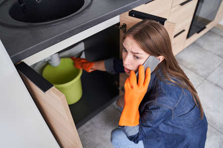 Woman needs help with leaking sink. Young housewife lady in yellow gloves whos trying to stop sink pipe leakage in the kitchen puts blue bucket pail under drain and calls commercial plumbing service